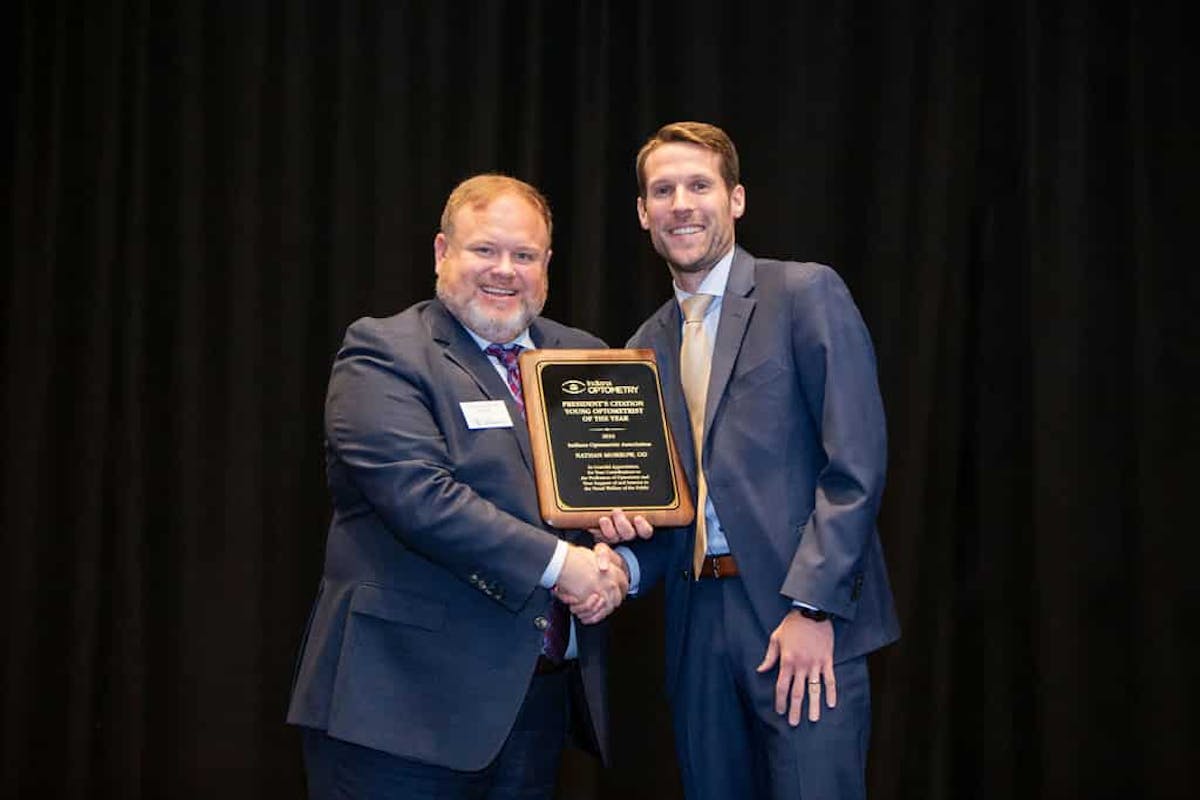 Nathan Morrow, OD, FAAO, an optometrist practicing at Eye Surgeons of Indiana in Indianapolis, has been named the 2024 Young Optometrist of the Year. The award, also called the President’s Citation, was presented on April 19, 2024, at Indiana Optometry’s Meeting and is awarded to a member of the Indiana Optometric Association (IOA) who is licensed ten years or less and has demonstrated not only contributions to the profession, but also in service for the benefit of the visual welfare of the public and service to the community at large.